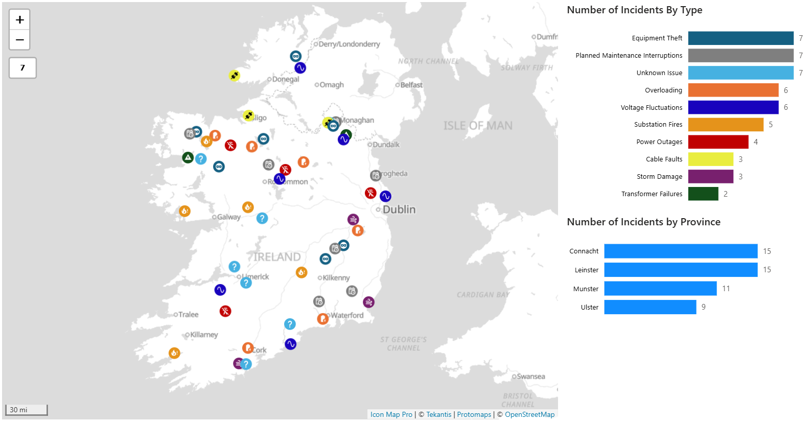The map below shows a variety of incidents across the electricity infrastructure in Ireland. To avoid map clutter, only the incidents are visible at max zoom level and as the user zooms into the map the infrastructure detail becomes visible e.g. power lines, substations, poles. The same principle can be applied to the display of service boundaries